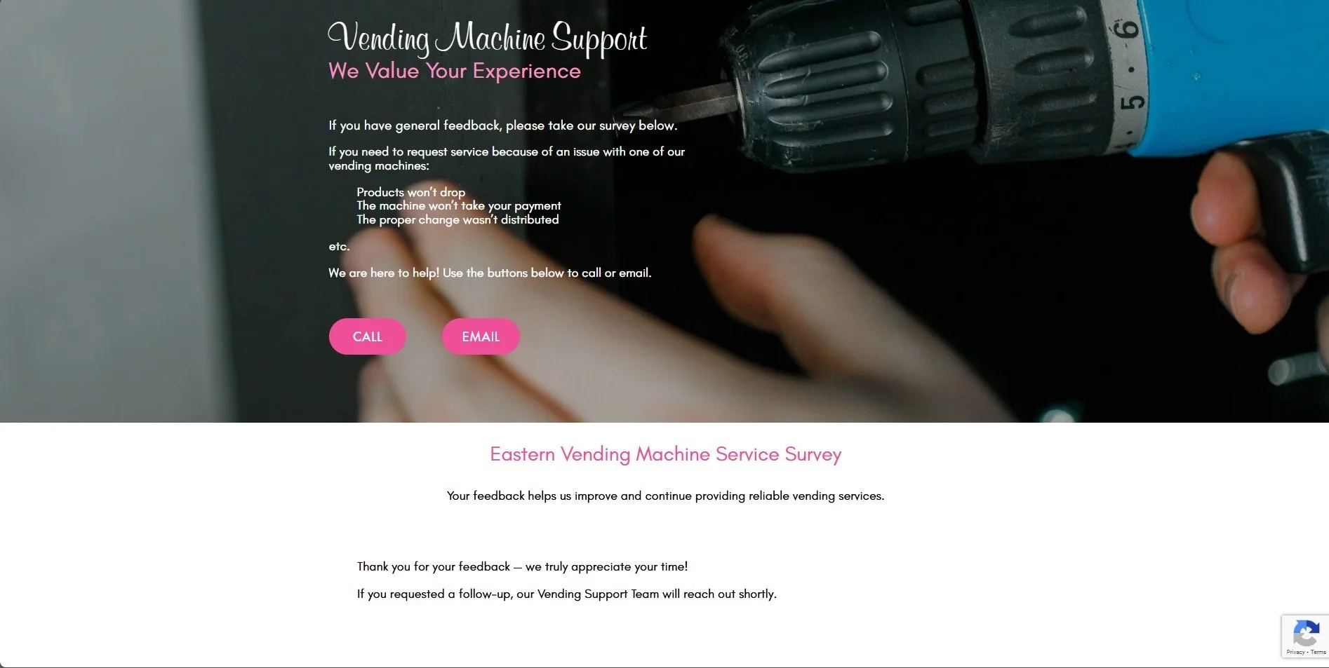 The vending division was receiving scattered or delayed service requests and had no streamlined way to gather feedback on machine performance or customer satisfaction. The goal was to create a clear, accessible point of contact and automate data collection for faster issue response and marketing insights.